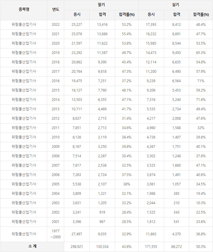 2022년까지 시행한 위험물산업기사 연도별 필기와 실기시험 자격검정 현황(응시인원, 합격인원, 합격률) 자료 출처는 한국산업인력공단에서 운영하는 웹사이트 큐넷(q-net.or.kr)입니다.