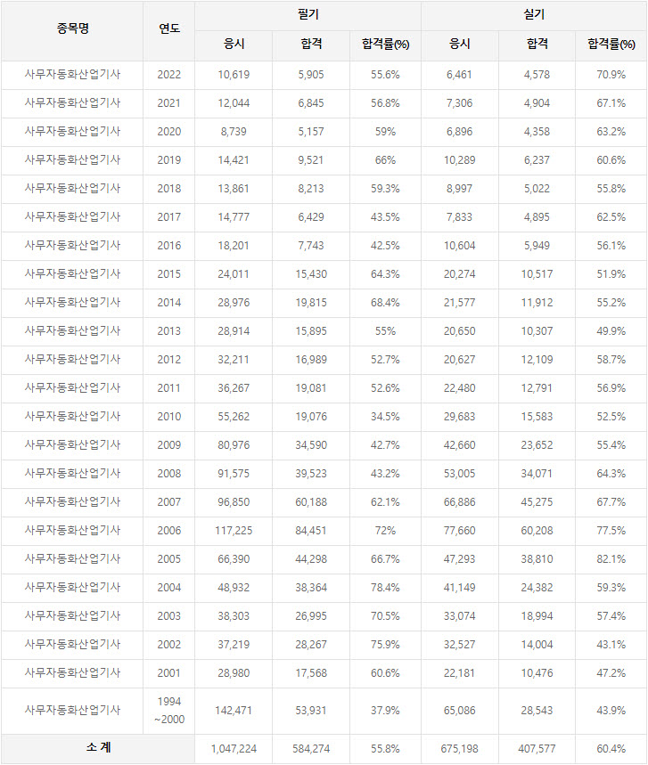 2022년까지 시행한 사무자동화산업기사 연도별 필기와 실기시험 자격검정 현황(응시인원, 합격인원, 합격률) 자료 출처는 한국산업인력공단에서 운영하는 웹사이트 큐넷(q-net.or.kr)입니다.