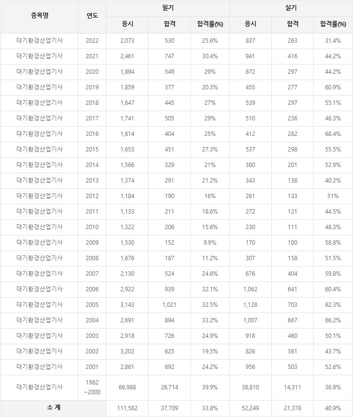 2022년까지 시행한 대기환경산업기사 연도별 필기와 실기시험 자격검정 현황(응시인원, 합격인원, 합격률) 자료 출처는 한국산업인력공단에서 운영하는 웹사이트 큐넷(q-net.or.kr)입니다.