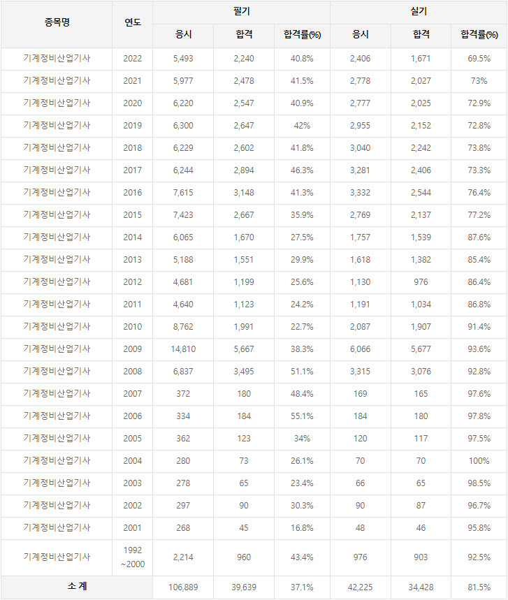 2022년까지 시행한 기계정비산업기사 연도별 필기와 실기시험 자격검정 현황(응시인원, 합격인원, 합격률) 자료 출처는 한국산업인력공단에서 운영하는 웹사이트 큐넷(q-net.or.kr)입니다.
