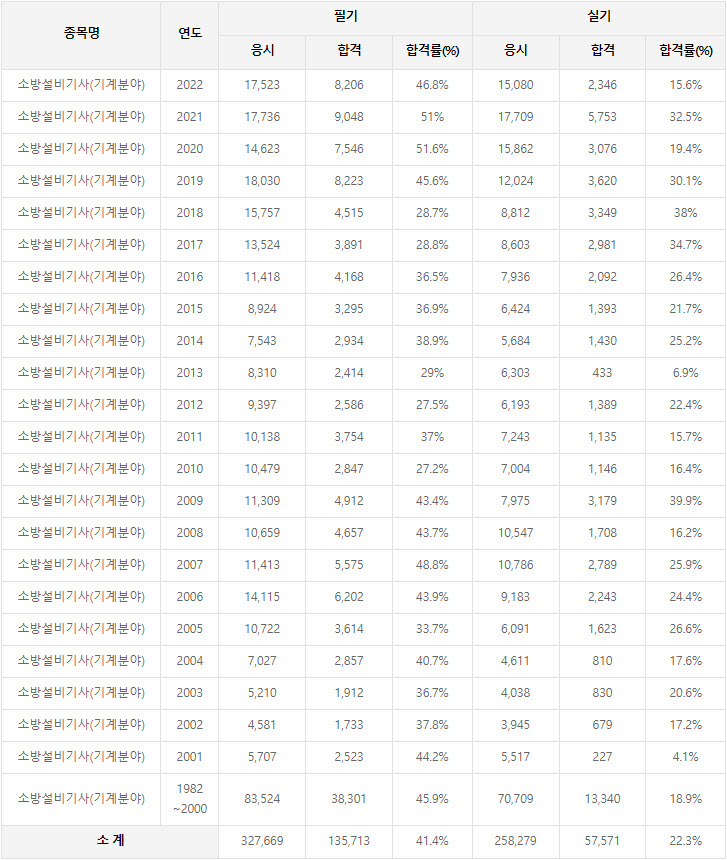 2022년까지 시행한 소방설비기사(기계분야) 연도별 필기와 실기시험 자격검정 현황(응시인원, 합격인원, 합격률) 자료 출처는 한국산업인력공단에서 운영하는 웹사이트 큐넷(q-net.or.kr)입니다.