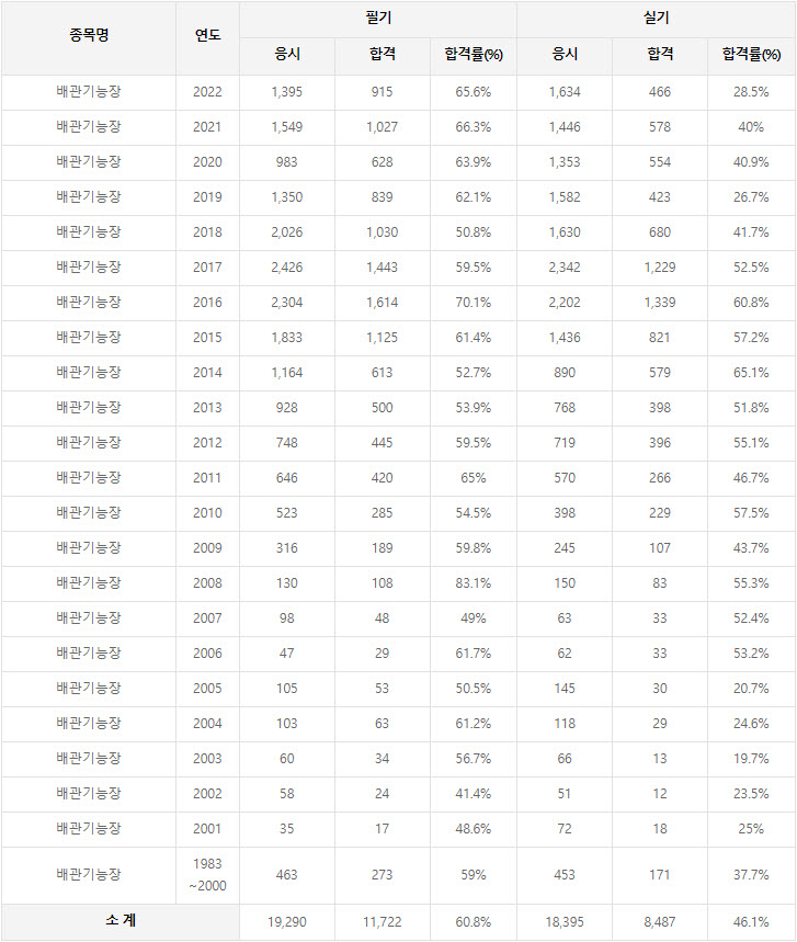 2022년까지 시행한 배관기능장 연도별 필기와 실기시험 자격검정 현황(응시인원, 합격인원, 합격률) 자료 출처는 한국산업인력공단에서 운영하는 웹사이트 큐넷(q-net.or.kr)입니다.