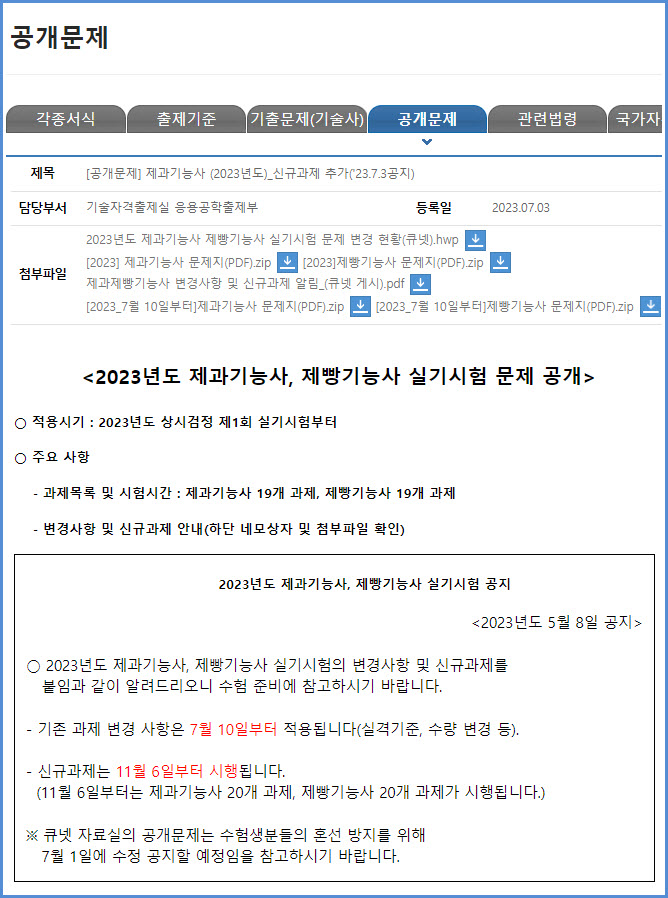 2023년 상시 1회 시험부터 적용되는 제과기능사 실기시험 공개 문제 내려받기 (큐넷 자료실)