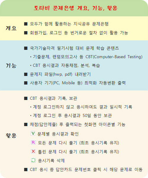 도타비 문제은행에 수록된 전기공사산업기사 필기 기출문제 모의고사, CBT는 연도별 자격검정 시행 회차로 구분된 필기시험 기출문제 또는 랜덤모의고사를 풀고, 자동 채점한 후 틀린 문제 다시 풀기 등의 추가 학습 기능이 탑재되어 있고, hwp와 pdf 파일로 작성된 문제지 파일이 첨부되어 있으며, 회원가입 및 로그인 등의 번거로운 절차를 거치지 않아도 모든 콘텐츠를 활용할 수 있습니다.