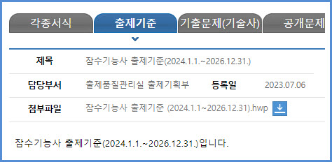 2024년부터 2026년까지 적용되는 잠수기능사 필기시험과 실기시험 출제기준은 자격검정 수탁 시행기관인 한국산업인력공단에서 운영하는 웹사이트 큐넷(q-net.or.kr)의 출제기준 자료실에서 가져온 첨부 파일을 참고하시기 바랍니다.