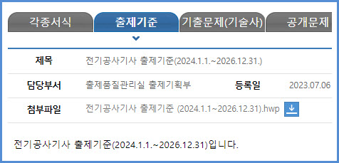 2024년부터 2026년까지 적용되는 전기공사기사 필기시험과 실기시험 출제기준은 자격검정 수탁 시행기관인 한국산업인력공단에서 운영하는 웹사이트 큐넷(q-net.or.kr)의 출제기준 자료실에서 가져온 첨부 파일을 참고하시기 바랍니다.