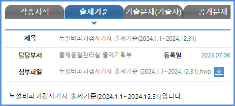 2024년도 적용되는 누설비파괴검사기사 필기시험과 실기시험 출제기준은 한국산업인력공단에서 운영하는 웹사이트 큐넷(q-net.or.kr)의 출제기준 자료실에서 가져온 첨부 파일을 참고하시기를 바랍니다.