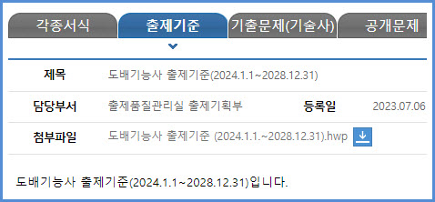 2024년부터 2028년까지 적용되는 도배기능사 실기시험 출제기준은 한국산업인력공단에서 운영하는 웹사이트 큐넷(q-net.or.kr)의 출제기준 자료실에서 가져온 첨부 파일을 참고하시기를 바랍니다.