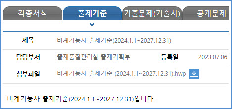 2024년부터 2027년까지 적용되는 비계기능사 필기시험과 실기시험 출제기준은 한국산업인력공단에서 운영하는 웹사이트 큐넷(q-net.or.kr)의 출제기준 자료실에서 가져온 첨부 파일을 참고하시기를 바랍니다.