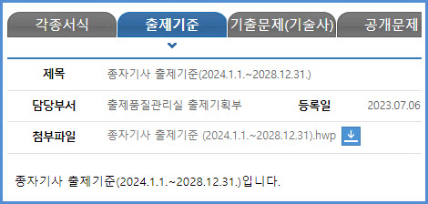 2024년부터 2028년까지 적용되는 종자기사 필기시험과 실기시험 출제기준은 한국산업인력공단에서 운영하는 웹사이트 큐넷(q-net.or.kr)의 출제기준 자료실에서 가져온 첨부 파일을 참고하시기를 바랍니다.