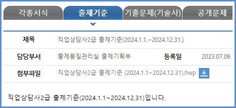2024년도 적용되는 직업상담사2급 필기시험과 실기시험 출제기준은 한국산업인력공단에서 운영하는 웹사이트 큐넷(q-net.or.kr)의 출제기준 자료실에서 가져온 첨부 파일을 참고하시기를 바랍니다.