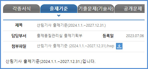 2024년부터 2027년까지 적용되는 산림기사 필기시험과 실기시험 출제기준은 한국산업인력공단에서 운영하는 웹사이트 큐넷(q-net.or.kr)의 출제기준 자료실에서 가져온 첨부 파일을 참고하시기를 바랍니다.