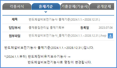 2024년부터 2028년까지 적용되는 반도체설비보전기능사 필기시험과 실기시험 출제기준은 한국산업인력공단에서 운영하는 웹사이트 큐넷(q-net.or.kr)의 출제기준 자료실에서 가져온 첨부 파일을 참고하시기를 바랍니다. (※ 반도체장비유지보수기능사 는 2024년부터 반도체설비보전기능사로 명칭이 변경됩니다.)