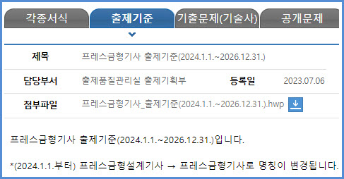 2024년부터 2026년까지 적용되는 프레스금형기사 필기시험과 실기시험 출제기준은 한국산업인력공단에서 운영하는 웹사이트 큐넷(q-net.or.kr)의 출제기준 자료실에서 가져온 첨부 파일을 참고하시기를 바랍니다.