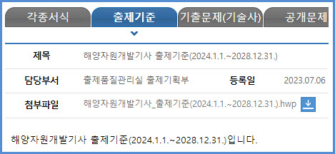 2024년부터 2028년까지 적용되는 해양자원개발기사 필기시험과 실기시험 출제기준은 한국산업인력공단에서 운영하는 웹사이트 큐넷(q-net.or.kr)의 출제기준 자료실에서 가져온 첨부 파일을 참고하시기를 바랍니다.