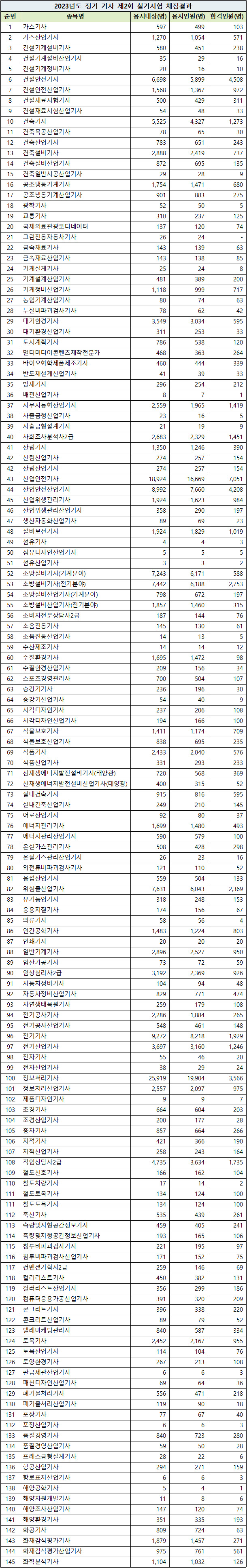 한국산업인력공단 2023년 2회 기사, 산업기사, 서비스 분야 국가기술자격 정기 실기시험 응시 현황
