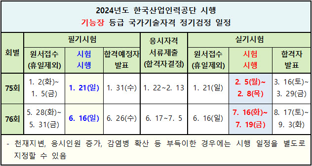 2024년 한국산업인력공단 시행 기능장 등급 국가기술자격검정 시행 일정