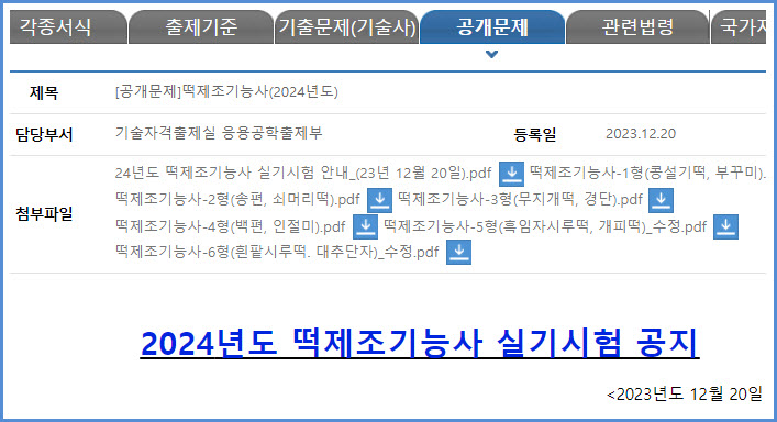 2024년 시험부터 적용되는 떡제조기능사 실기시험 공개 문제 내려받기 (큐넷 자료실)