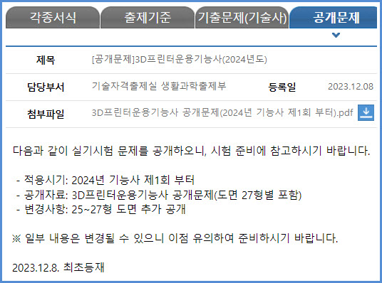 2024년 시험부터 적용되는 3D프린터운용기능사 실기시험 공개 문제 내려받기 (큐넷 자료실)