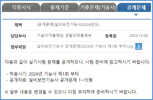 2024년 시험부터 적용되는 설비보전기능사 실기시험 공개 문제 내려받기 (큐넷 자료실)