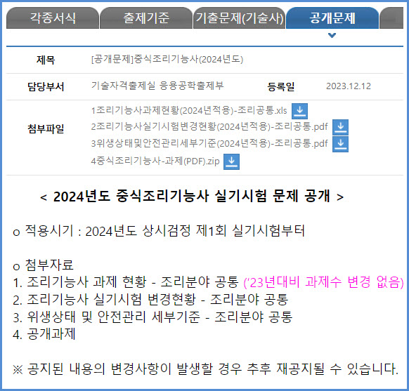 | 2024년 시험부터 적용되는 한식조리기능사 실기시험 공개 문제 내려받기 (큐넷 자료실) (0) | 2023.12.26 |