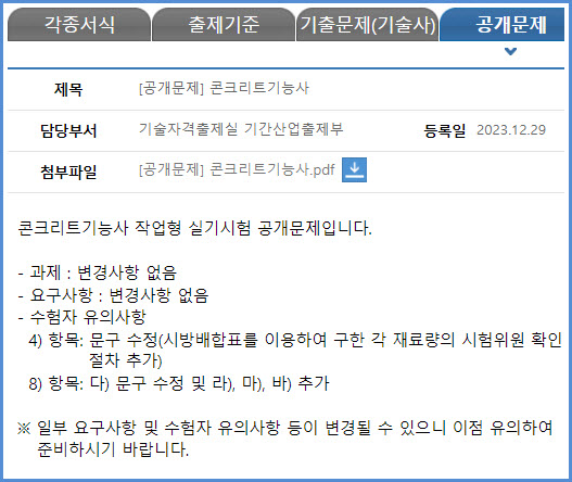 | 2024년 시험부터 적용되는 콘크리트기사 실기시험 공개 문제 내려받기 (큐넷 자료실) (0) | 2023.12.29 |