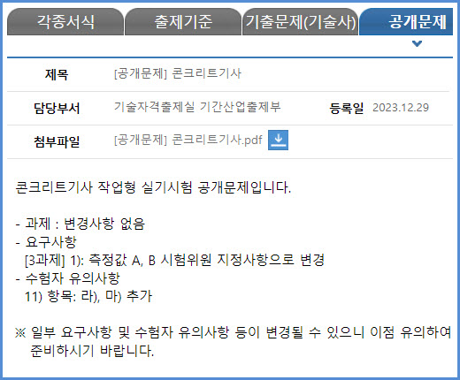 | 2024년 시험부터 적용되는 콘크리트기능사 실기시험 공개 문제 내려받기 (큐넷 자료실) (0) | 2023.12.29 |