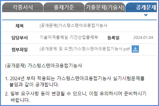 2024년 시험부터 적용되는 가스텅스텐아크용접기능사 실기시험 공개 문제 내려받기 (큐넷 자료실)