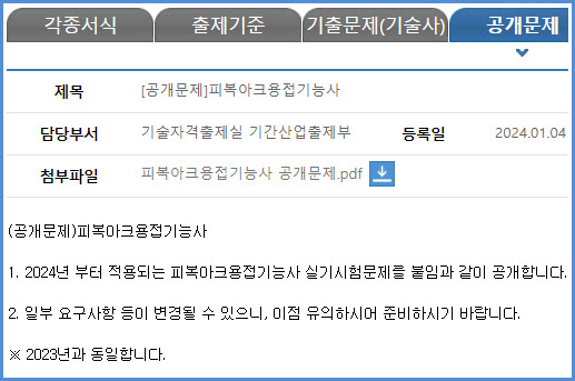 | 2024년 시험부터 적용되는 용접산업기사 실기시험 공개 문제 내려받기 (큐넷 자료실) (0) | 2024.01.04 |