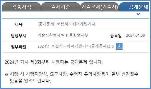 로봇하드웨어개발기사 자격검정 수탁 기관인 한국산업인력공단에서는 운영 중인 웹사이트 큐넷의 공개문제 자료실에 로봇하드웨어개발기사 실기시험 공개문제 파일을 등록하고 있습니다.