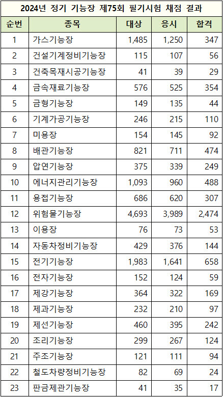 한국산업인력공단 2024년 시행 75회 기능장 필기시험 종목별 현황 (응시인원, 합격인원)