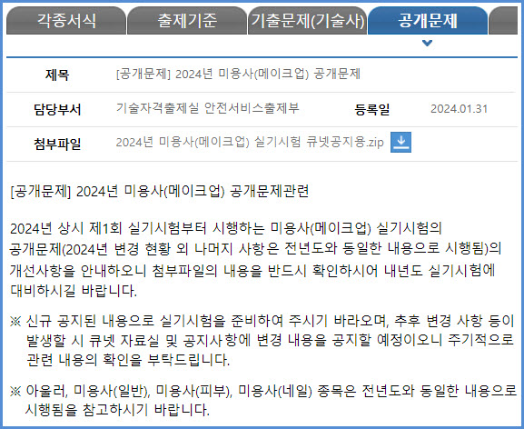 2024년 시험부터 적용되는 미용사(메이크업) 실기시험 공개 문제 내려받기 (큐넷 자료실)