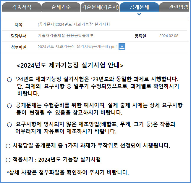 2024년 시험부터 적용되는 제과기능장 실기시험 공개 문제 내려받기 (큐넷 자료실)