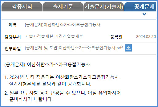 2024년 시험부터 적용되는 이산화탄소가스아크용접기능사 실기시험 공개 문제 내려받기 (큐넷 자료실)