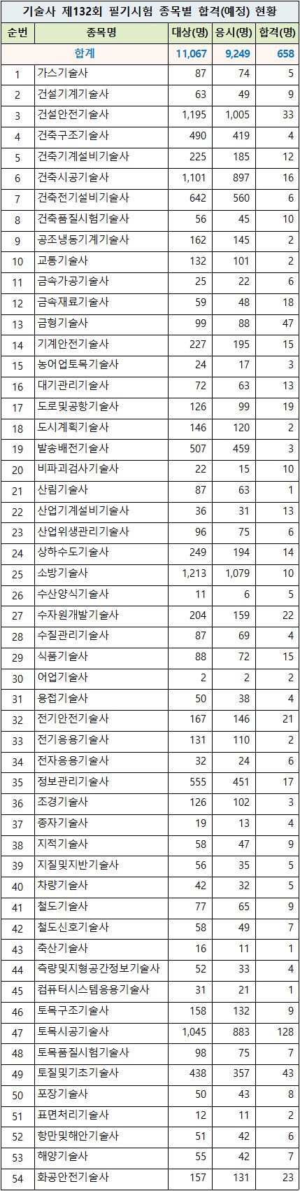 한국산업인력공단 2024년 시행 132회 기술사 필기시험 결과 원자료를 살펴보면 응시원서를 접수한 응시대상 11,067명 중 9,249명이 시험에 응시하여 658명이 합격하였음을 확인할 수 있습니다.