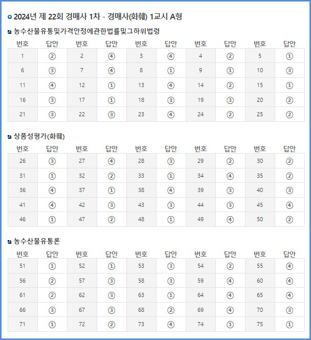 2024년 한국산업인력공단 시행 22회 경매사(화훼) 1차 시험 가답안 (3월 9일 시행)