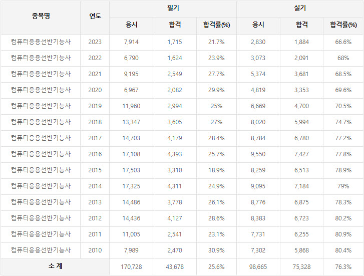 2023년까지 시행한 컴퓨터응용선반기능사 연도별 필기와 실기시험 자격검정 현황(응시인원, 합격인원, 합격률) 자료 출처는 한국산업인력공단에서 운영하는 웹사이트 큐넷(q-net.or.kr)입니다.