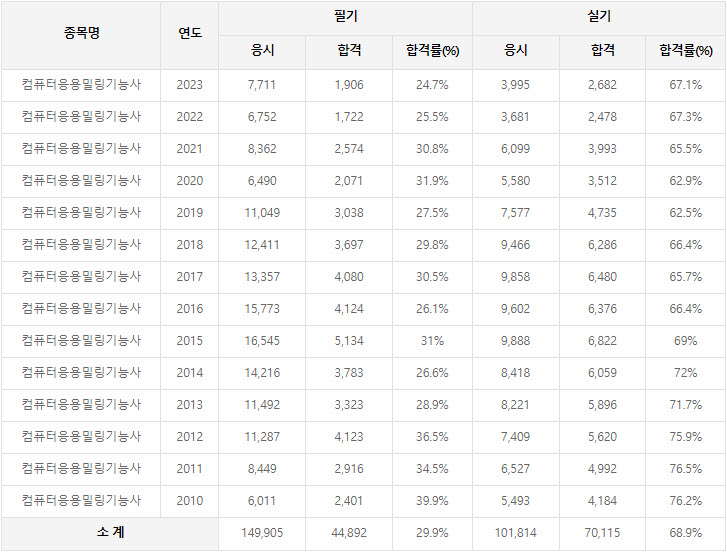 2023년까지 시행한 컴퓨터응용밀링기능사 연도별 필기와 실기시험 자격검정 현황(응시인원, 합격인원, 합격률) 자료 출처는 한국산업인력공단에서 운영하는 웹사이트 큐넷(q-net.or.kr)입니다.
