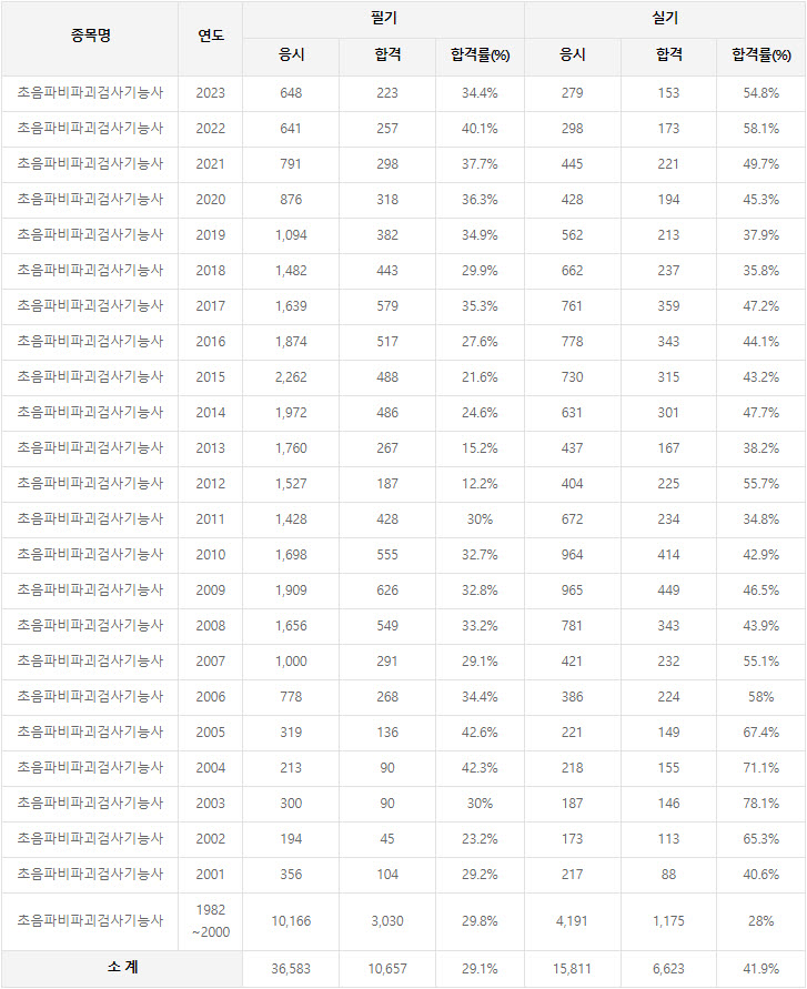 2023년까지 시행한 초음파비파괴검사기능사 연도별 필기와 실기시험 자격검정 현황(응시인원, 합격인원, 합격률) 자료 출처는 한국산업인력공단에서 운영하는 웹사이트 큐넷(q-net.or.kr)입니다.