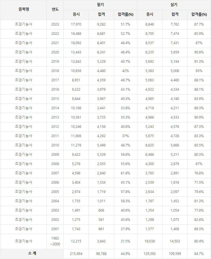 2023년까지 시행한 조경기능사 연도별 필기와 실기시험 자격검정 현황(응시인원, 합격인원, 합격률) 자료 출처는 한국산업인력공단에서 운영하는 웹사이트 큐넷(q-net.or.kr)입니다.