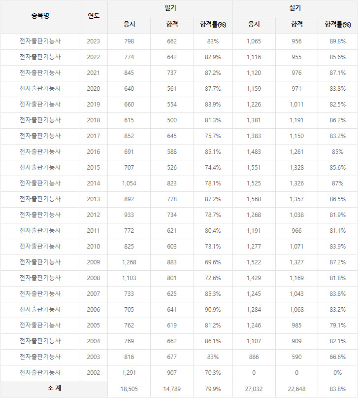 2023년까지 시행한 전자출판기능사 연도별 필기와 실기시험 자격검정 현황(응시인원, 합격인원, 합격률) 자료 출처는 한국산업인력공단에서 운영하는 웹사이트 큐넷(q-net.or.kr)입니다.