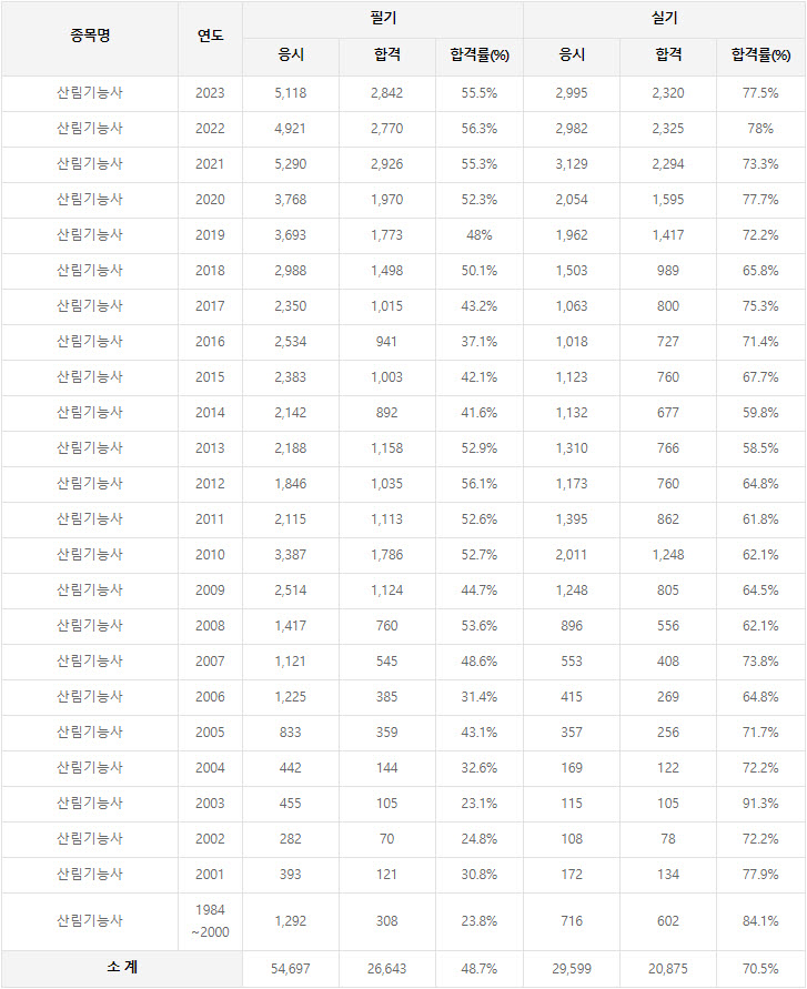 2023년까지 시행한 산림기능사 연도별 필기와 실기시험 자격검정 현황(응시인원, 합격인원, 합격률) 자료 출처는 한국산업인력공단에서 운영하는 웹사이트 큐넷(q-net.or.kr)입니다.