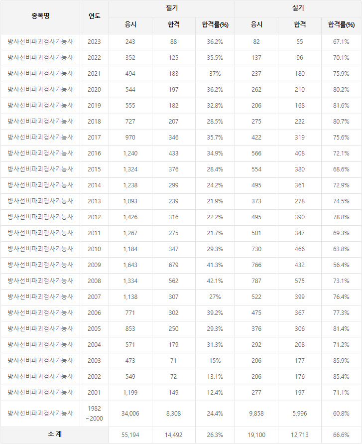 2023년까지 시행한 방사선비파괴검사기능사 연도별 필기와 실기시험 자격검정 현황(응시인원, 합격인원, 합격률) 자료 출처는 한국산업인력공단에서 운영하는 웹사이트 큐넷(q-net.or.kr)입니다.