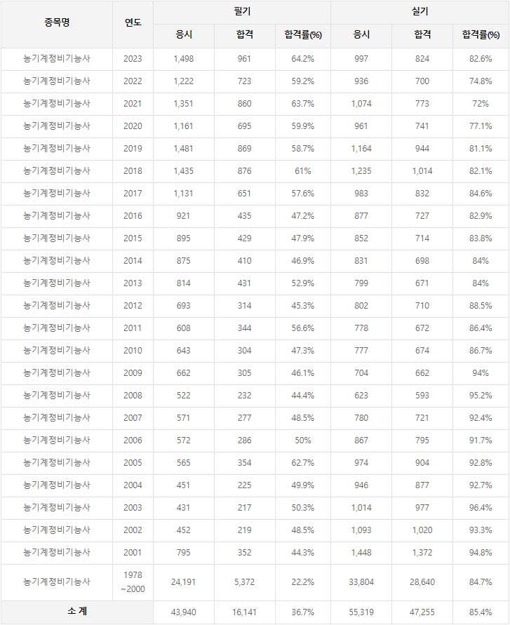 2023년까지 시행한 농기계정비기능사 연도별 필기와 실기시험 자격검정 현황(응시인원, 합격인원, 합격률) 자료 출처는 한국산업인력공단에서 운영하는 웹사이트 큐넷(q-net.or.kr)입니다.