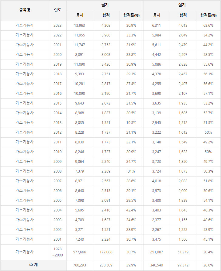2023년까지 시행한 가스기능사 연도별 필기와 실기시험 자격검정 현황(응시인원, 합격인원, 합격률) 자료 출처는 한국산업인력공단에서 운영하는 웹사이트 큐넷(q-net.or.kr)입니다.