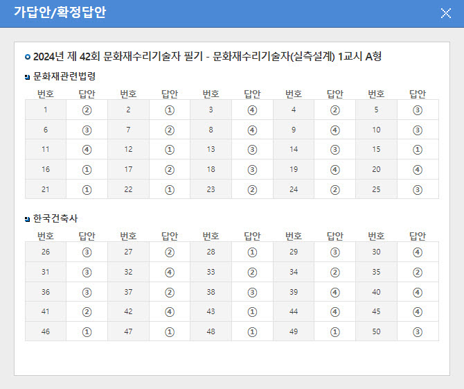 2024년 한국산업인력공단 시행 42회 문화재수리기술자(실측계측) 1차 시험 가답안 (3월 23일 시행)