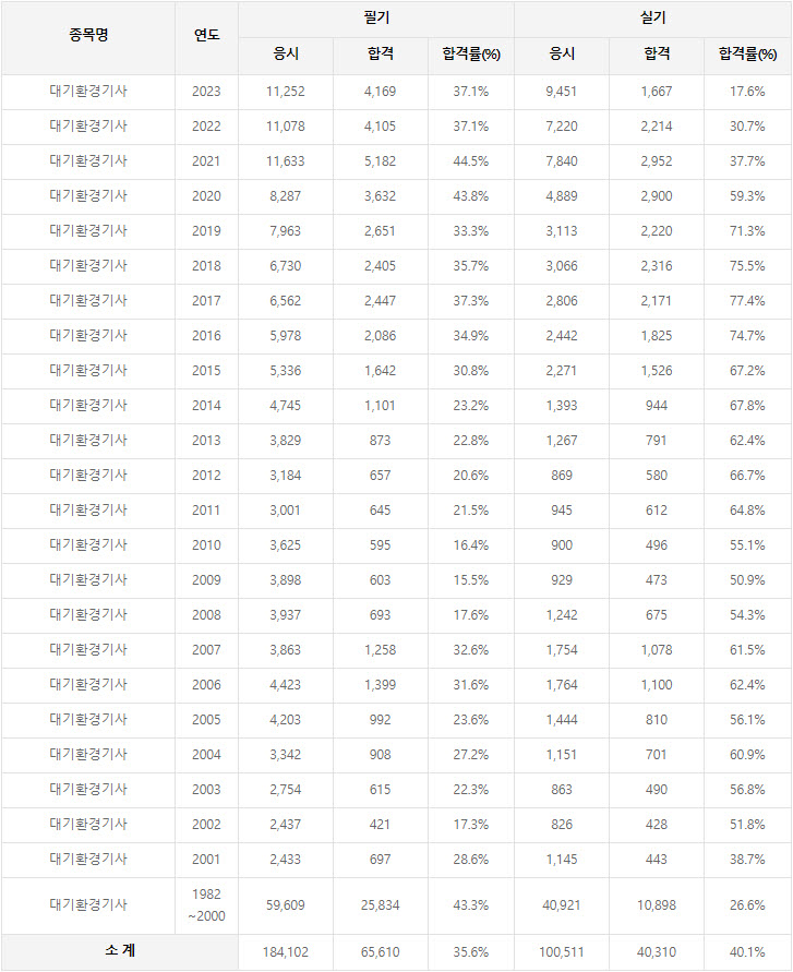 2023년까지 시행한 대기환경기사 연도별 필기와 실기시험 자격검정 현황(응시인원, 합격인원, 합격률) 자료 출처는 한국산업인력공단에서 운영하는 웹사이트 큐넷(q-net.or.kr)입니다.