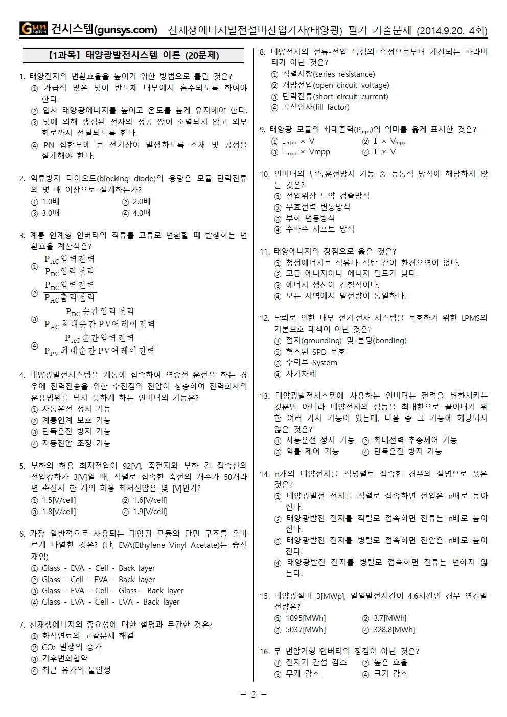 ■ 2014년 4회 신재생에너지발전설비산업기사(태양광) 필기 기출문제 CBT 응시, 문제 파일 내려받기 (↓)