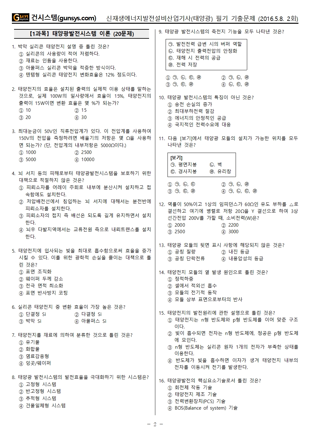 ■ 2016년 2회 신재생에너지발전설비산업기사(태양광) 필기 기출문제 CBT 응시, 문제 파일 내려받기 (↓)