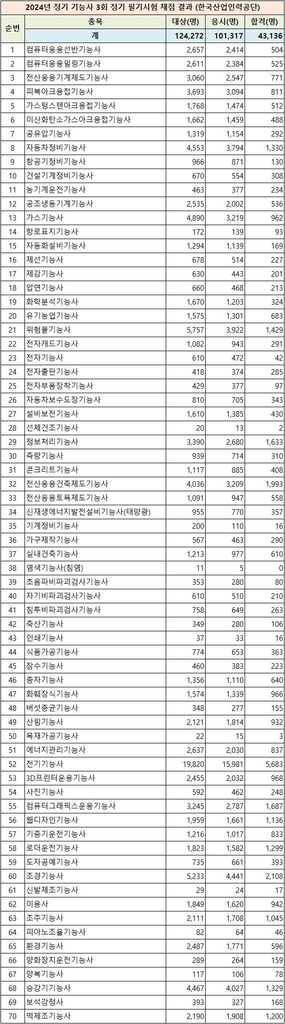 ■ 2024년 3회 기능사 필기시험 종목(70)